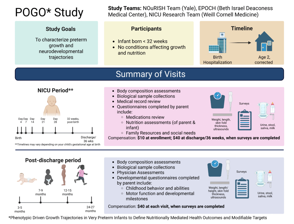 The Phenotypic Driven Growth Trajectories in Very Preterm Infants to Define Nutritionally Mediated Health Outcomes and Modifiable Targets study, or POGO (Patterns of Growth and Outcomes) study focuses on understanding how the growth of very premature infants develops based on different factors like their health, the nutrition they receive, body composition, and their physical and social environment. It is a multisite project involving three research/health facilities, including the Yale-New Haven Hospital in New Haven, Weill Cornell Medical College/New York-Presbyterian Hospital in New York, and the Beth Israel Deaconess Medical Center (BIDMC) in Boston.
